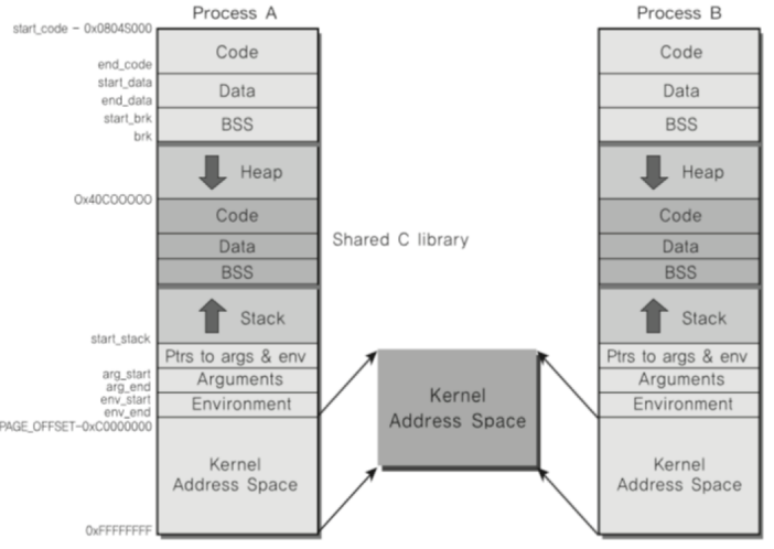 그 중 한 공간은 커널(운영체제)이 사용하는 전용 공간으로 둔다. 각 프로세스들은 메모리 자원이 필요할 때, 시스템콜을 호출하여 커널 메모리 공간에 있는 자원을 가져올 수 있다.