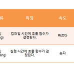 * 동적 바인딩 함수 호출을 실제 함수의 몸체와 연결하는 것을 바인딩(binding)이라고 한다. 바인딩에는 정적 바인딩과 동적 바인딩이 존재한다. 컴파일 단계에서 모든 바인딩이 완료되는 것을 정적 바인딩(static binding)이라고 한다. 반대로 바인딩이 실행 시까지 연기되고 실행 시간에 실제 호출되는 함수를 결정하는 것을 동적 바인딩(dynamic binding)이라 한다. 동적 바인딩을 사용하면 객체 지향의 중요한 특징 중 하나인 다형성을 구현할 수 있다. 즉 객체에 메시지를 보내면 객체가 메시지를 해석해서 가장 적절한 동작을 하게 된다. c++에서 가상 함수가 아니면 모든 함수가 정적 바인딩으로 호출된다. 정적 바인딩은 호출 속도가 빠르지만 호출 함수가 컴파일 단계에서 항상 결정되므로 유연성..